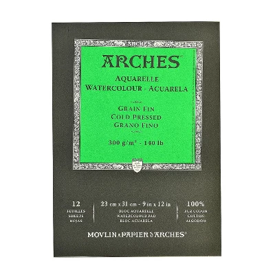 Exceptional Arches 140 lb. watercolor paper in a convenient pad. Top tape bound with 12 sheets in natural white. Mould made in France, 100% rag, watermarked. Hand inspected, great consistency in surface, texture and performance; sized in beater and agai n after sheet has been formed; allows for repeated erasures and overpainting without any feathering. Special felts give a handsome grain finish to the watercolor paper. Exceptional Arches 140 lb. watercolor paper in a convenient pad. Top tape bound with 12 sheets in natural white. Mould made in France, 100% rag, watermarked. Hand inspected, great consistency in surface, texture and performance. Sized in beater and again after sheet has been formed. Allows for repeated erasures and overpainting without any feathering. Special felts give a handsome grain finish to the watercolor paper. size: 9 in. x 12 in. description: cold pressed. weight: 140 lb. Mold made in France, 100% rag, watermarked.