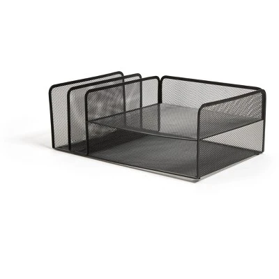 Customize your document sorting system with this black mesh file organizer. Save space on your desktop with this file organizer. Two horizontal slots and two vertical compartments make it easy to organize paperwork, while the reinforced mesh ribbing prevents bowing for long-lasting use. Flat square-rounded edges and a neutral matte black hue give your workspace a modern style upgrade. Featuring integrated feet, this black mesh file organizer stays firmly in place without scratching or scuffing your desk. Organize files and papers with this multiple load 4-tier file organizer. The organizer measures 17.4″L x 11.2″W x 6.54″H and has four compartments. Updated tray feet prevent slipping and scratching when put on top of desk. Flat square-rounded edges offer a sleeker design aesthetic Includes two vertical and two horizontal slots. Organize files and papers with this multiple load 4-tier file organizer. The organizer measures 17.4″L x 11.2″W x 6.54″H and has four compartments. Updated tray feet prevent slipping and scratching when put on top of desk. Flat square-rounded edges offer a sleeker design aesthetic. Sold as 1 Each.
