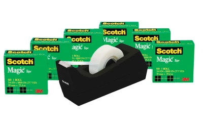 Scotch Magic Tape with C-38 desktop dispenser. Scotch 810 Magic Tape is the original matte-finish, invisible tape. Comes off the roll smoothly, cuts easily. Stands up to faxes, scanners and copiers. Preferred tape for offices, homes and schools. It’s famous matte-finish invisible tape uses unique 3M adhesive technology to bond tightly with paper and disappear without a trace. Write on it with pencil, pen or marker. Photo safe. 1 inch core. Set of 6 tapes and 1 desktop dispenser.