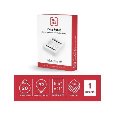 Take on your everyday printing with this TRU RED 8.5″ x 11″ white printer paper. Ensure all jobs print clearly every time with this pack of white printer paper. Engineered to prevent jamming in your machines, this letter-size paper is an ideal option for every day home and office printing. The 92 brightness rating and 20 lb. paper weight works well with black and white printing, providing a crisp backdrop for text and images. Featuring 500 sheets per ream, this Tru Red 8.5″ x 11″ white printer paper delivers the right amount of paper for your everyday printing needs. Copy printer paper that is best for high volume, black white printing. Paper weight: 20 lbs. Sheet Dimension: 8.5W” x 11″L (US Letter). Brightness rating of 92 for sharp, clear print results. White paper with a Matte finish. 500 sheets per ream. Paper is acid-free to prevent crumbling or yellowing. Engineered to prevent jamming. Designed for high-speed printers. Packaging may vary. Sold as 500/Ream.