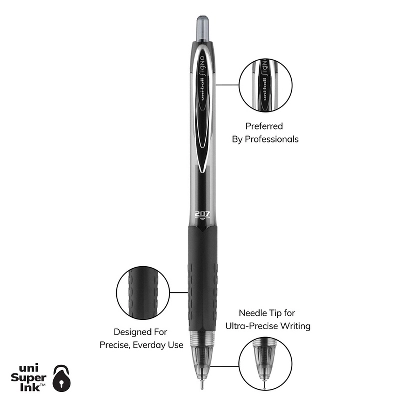 Write smoothly with this 12-pack of uni-ball 207 0.7mm medium-needle retractable black gel pens. Stock your office, home or classroom with 207 Needle Retractable Gel Pens from uniball featuring a 0.7mm medium point. These needle point pens are designed with a bend resistant tip for better accuracy. Even-flowing, pigment-based gel ink delivers a smooth writing experience for intense, vibrant lines, ensuring that every mark is brilliantly communicated. Use these retractable gel pens for everyday writing tasks, check signing and all of your important signatures, trusting its quick-drying uni Super Ink. Innovative uni Super Ink technology effectively entraps the gel ink into the paper, producing fraud, fade and water-resistant documents that resist check washing or bleaching. The 0.7mm medium needle point allows you to create ultra-precise, straight edge lines with ease. A textured grip offers greater comfort and control as you continue writing, while a translucent ink window indicates the level of gel ink remaining, so you don’t run out unexpectedly. The sleek design of the 207 with modern metal accents gives the retractable gel pen a stylish touch. The medium 0.7 mm needle point allows you to create accurate straight edge lines and deliver highly precise work with ease. Water and fade-resistant gel ink helps you compose long-lasting, high-quality documents you can archive. uni Super Ink entraps the gel ink in the paper, creating a strong bond that resists document fraud. A textured rubber grip ensures ease of writing while helping you maintain good control; convenient clip ensures that your favorite gel pen is always at hand. Professional’s first choice gel pen with stylish metallic accents and a high-quality finish. Comfort grip for superior control. Features a pocket clip for convenient carrying. Refillable ink allows pens to be reused instead of replaced to save money. Gel pens feature smooth-flowing pigment-based ink with vibrant..
